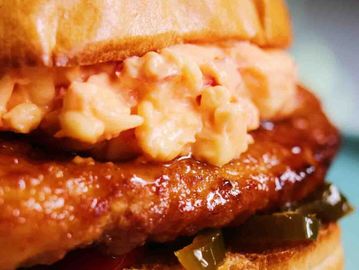 Fried Chicken Sandwich topped with Homemade Pimento Cheese, Honey Mustard and Pickled Jalapenos on a Toasted Bun.